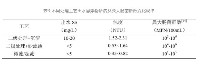 水中的懸浮顆粒物影響水中病原微生物含量,不同處理工藝出水懸浮物濃度與糞大腸菌群數(shù)如表3所示。同時(shí)懸浮顆粒物還能夠?qū)ο拘Чa(chǎn)生直接影響。通過協(xié)同消毒工藝前端砂濾、膜過濾等處理單元的設(shè)置,提高水中懸浮顆粒物的截留效果??捎行嵘粞?、紫外與次氯酸鈉對(duì)直接暴露在水中的病原微生物的滅活效率,過濾工藝在對(duì)致濁顆粒物去除的同時(shí)伴隨著部分病原微生物的截留。