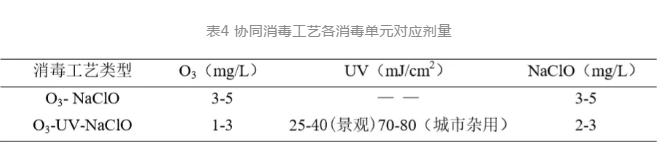 3)“O3-NaClO”協(xié)同消毒工藝,臭氧劑量維持3-5 mg/L,NaClO劑量根據(jù)水量與接觸池(清水池)容積維持CT值不低于8 mg·min/L可以較穩(wěn)定的實(shí)現(xiàn)糞大腸菌群<2 CFU/L的消毒效果,同時(shí)節(jié)省NaClO投加量。“O3-UV-NaClO”協(xié)同消毒工藝,臭氧1-3 mg/L的投加量能夠提升30%紫外透射率,在紫外消毒單元設(shè)計(jì)劑量下(景觀用水30 mJ/cm2,城市雜用水80 mJ/cm2),紫外出水能夠?qū)崿F(xiàn)糞大腸菌群<2 CFU/L;后續(xù)根據(jù)再生水用途及管網(wǎng)輸配要求進(jìn)行適當(dāng)補(bǔ)氯,保障出水余氯達(dá)到相應(yīng)標(biāo)準(zhǔn)。