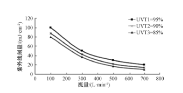 判斷一個設(shè)備廠家提供的紫外消毒設(shè)備方案其消毒性能是否滿足工程的設(shè)計要求,關(guān)鍵是看其方案所能實現(xiàn)的照射到微生物上紫外能量的多少,即紫外劑量是否滿足消毒目標的設(shè)計要求。紫外劑量的計算方法很多,其中唯一被世界各地包括我國法規(guī)標準制定和執(zhí)行部門認可與接受的就是生物驗定劑量方法。這個方法是在一定測試條件(工況)下,通過對微生物進出紫外消毒設(shè)備前后存量濃度的變化反推,得到設(shè)備在該測試條件下能夠傳遞的有效紫外劑量(即設(shè)備的實際劑量),然后改變測試條件(通常是設(shè)備處理的流量、水質(zhì)),即可得到該設(shè)備在不同工況下的紫外劑量曲線,如圖1所示。