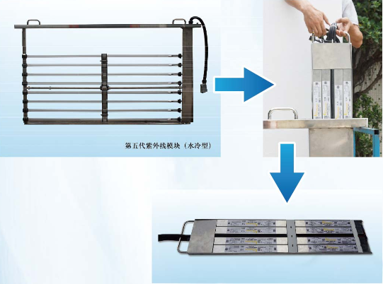 5、模塊標(biāo)準(zhǔn)設(shè)計為8根燈管,采用優(yōu)質(zhì)不銹鋼材料制造,根據(jù)客戶處理水量、水質(zhì)及殺菌要求等不同情況,提供3-12根燈管的多種設(shè)計,電線電纜密封在清洗模塊內(nèi),且有獨特的固封技術(shù),不會暴露在污水和紫外線中。